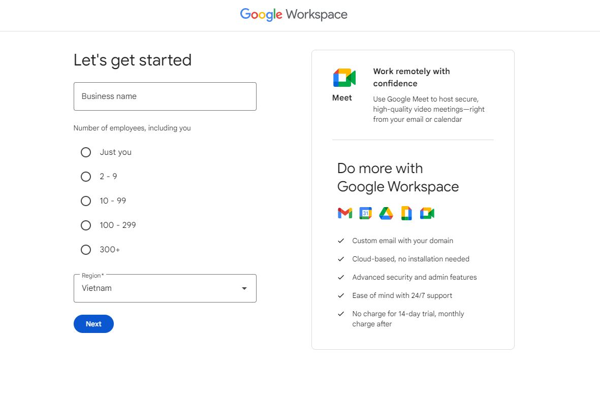 Gmail cho doanh nghiệp có thời gian dùng thử không tính phí 14 ngày, vì vậy tổ chức có thể dùng thử mà không gặp rủi ro và sau đó đăng phí trả phí. Nếu quyết định không tiếp tục đăng ký giải pháp, bạn có thể hủy giấy phép và sẽ không bị tính phí.