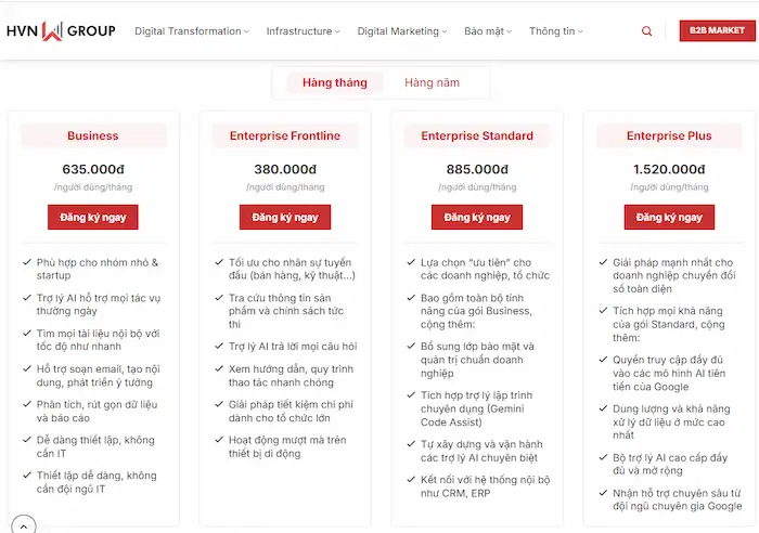 - Tư vấn chuyên sâu theo nhu cầu thực tế của doanh nghiệp: HVN Group đánh giá quy mô, mục tiêu và yêu cầu sử dụng Gemini để gợi ý gói phù hợp, giúp doanh nghiệp khai thác tối đa tính năng.