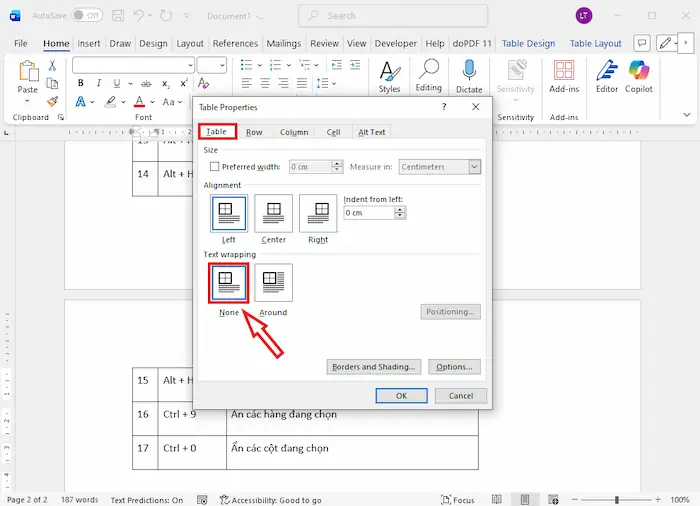 – Bước 2: Tại thẻ Table, tìm mục Text wrapping.