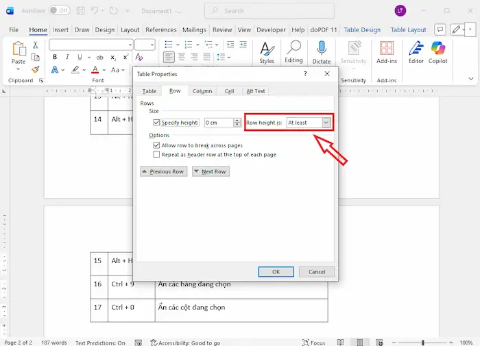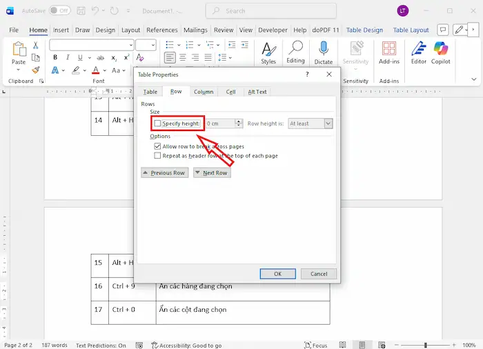 – Bước 1: Vào lại Table Properties… >> chọn thẻ Row.