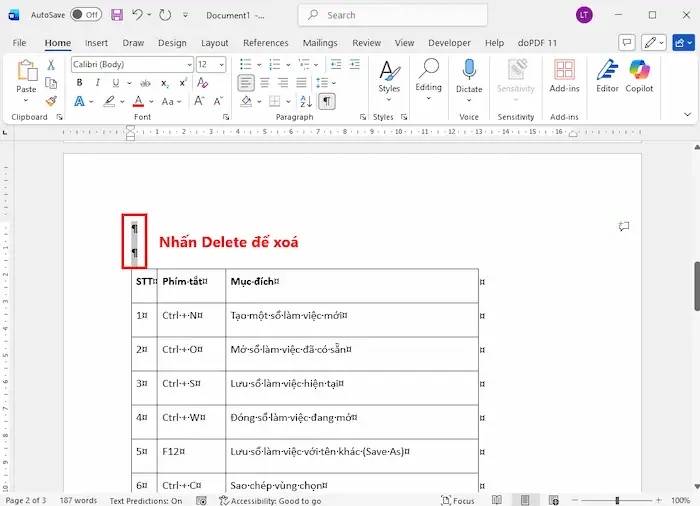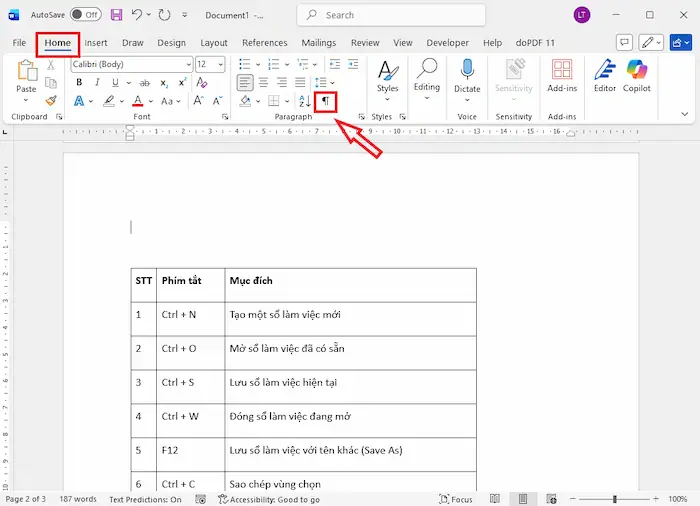 Hiển thị các ký tự đặc biệt giúp bạn dễ dàng quan sát cấu trúc ẩn của văn bản. Bằng cách này, bạn có thể phát hiện ngay lập tức các dấu ngắt trang hoặc dòng trống dư thừa đang chiếm diện tích, giúp việc quản lý vị trí bảng trở nên minh bạch và dễ dàng hơn.