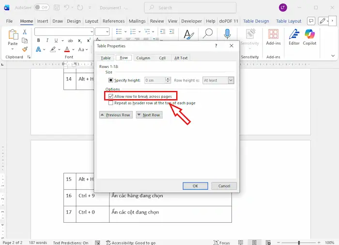 – Bước 3: Tại thẻ Row, tích chọn vào ô Allow row to break across pages.