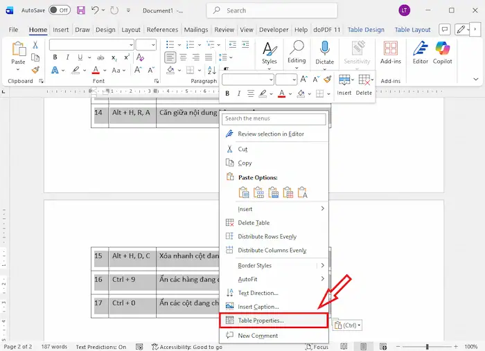 – Bước 1: Chuột phải vào bảng, chọn Table Properties…