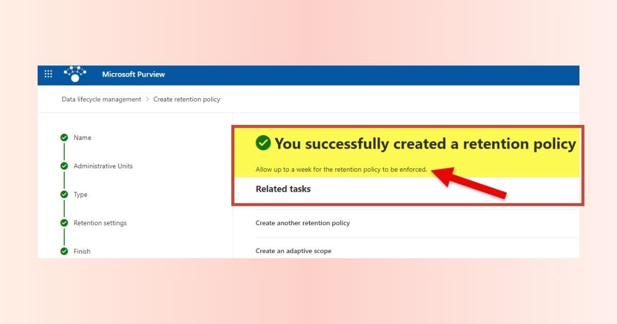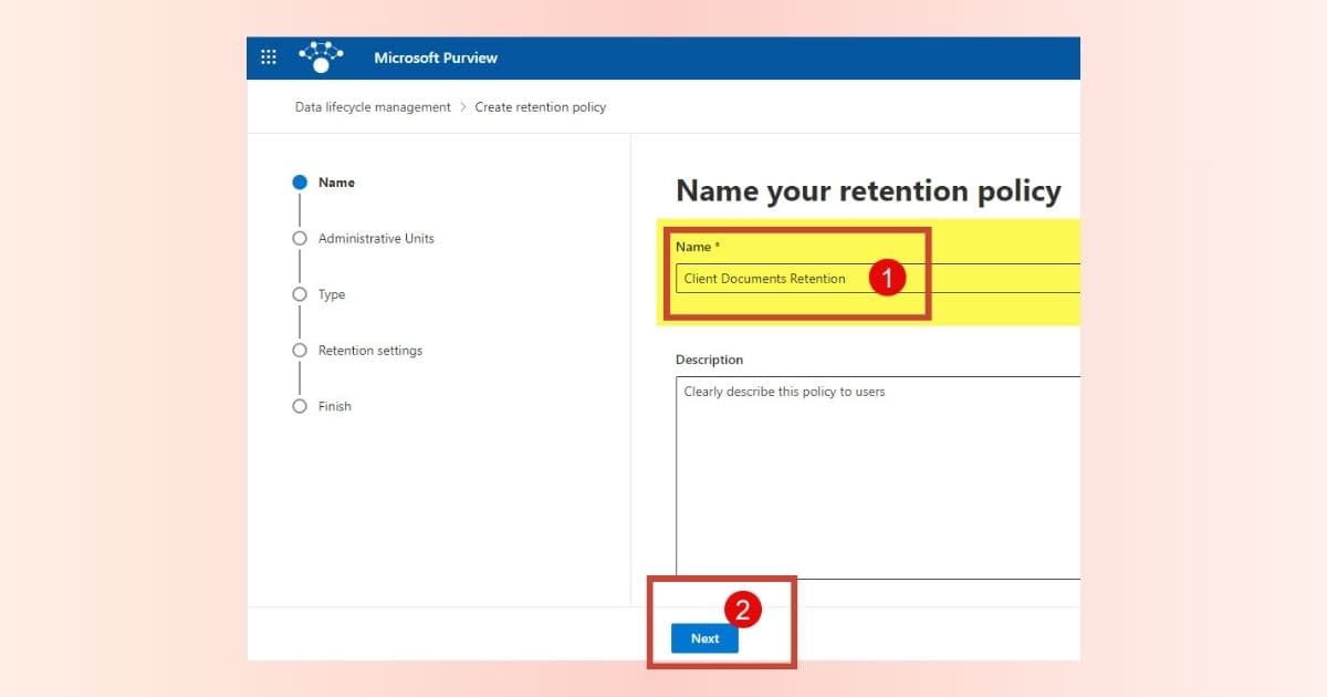 Đặt tên gợi nhớ cho chính sách (ví dụ: “Lưu trữ dữ liệu dự án 7 năm”) và nhấn Next.