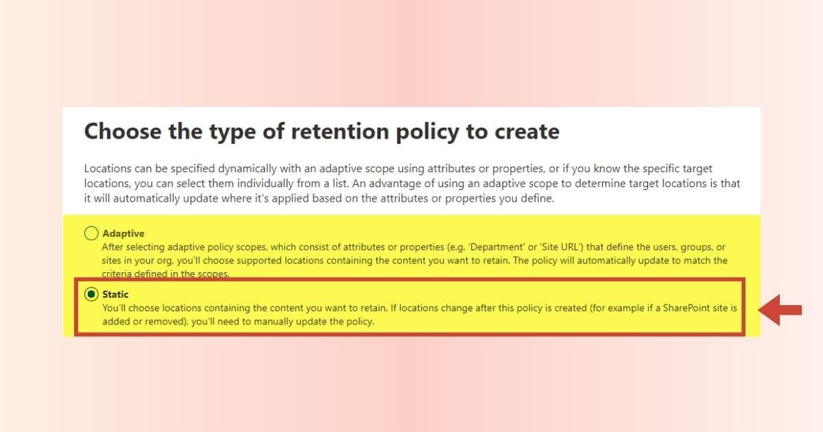 Loại chính sách: Chọn Static (Tĩnh) nếu bạn muốn tự tay chọn các trang SharePoint cụ thể, hoặc Adaptive (Thích ứng) nếu muốn hệ thống tự áp dụng dựa trên thuộc tính của trang. (Thông thường chọn Static cho các nhu cầu cơ bản). Ở đây chúng tôi sẽ chọn Static.