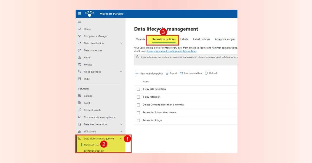 Tại menu bên trái, tìm mục Data lifecycle management (Quản lý vòng đời dữ liệu) và chọn Microsoft 365. Sau đó, chuyển sang thẻ Retention policies (Chính sách lưu giữ).
