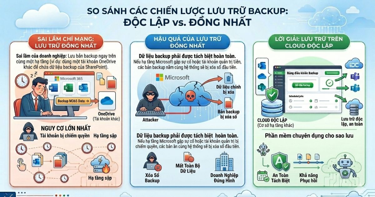 Dữ liệu backup phải được tách biệt hoàn toàn. Nếu hạ tầng Microsoft gặp sự cố hoặc tài khoản quản trị bị chiếm quyền, các bản backup nằm cùng hệ thống sẽ bị xóa sổ đầu tiên.