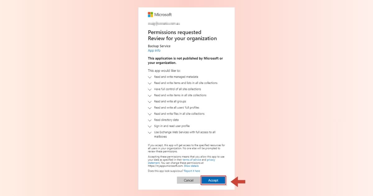 Đọc kỹ danh sách các quyền truy cập và nhấn Accept (Chấp nhận) để cho phép Acronis kết nối với dữ liệu Microsoft 365.