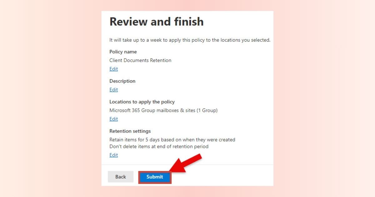 • Bước 6: Kiểm tra lại toàn bộ các thiết lập trong bảng tổng hợp cuối cùng. Sau đó, nhấn Submit để kích hoạt chính sách.
