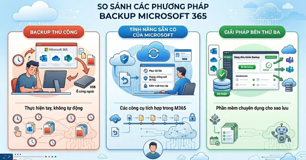 Hiện nay, bạn có thể lựa chọn nhiều cách backup cho Microsoft 365, tùy theo nhu cầu, ngân sách và mức độ quan trọng của dữ liệu. Tuy nhiên, không phải cách nào cũng đảm bảo tính an toàn và khả năng khôi phục khi xảy ra sự cố.