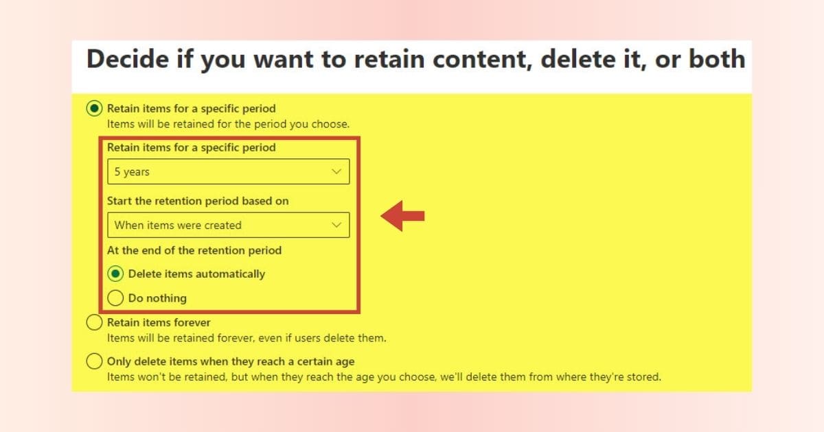 + Hành động sau khi hết hạn: Bạn có thể chọn Delete items automatically (Tự động xóa) hoặc Do nothing (Không làm gì, chỉ tắt chế độ bảo vệ).
