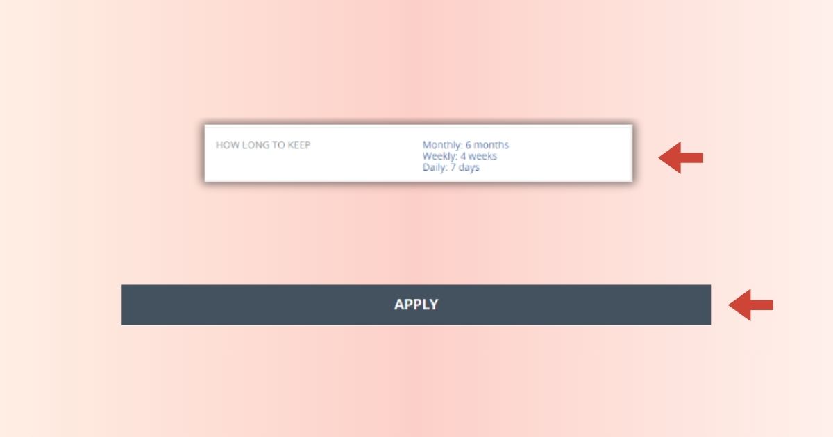 Thiết lập thời gian lưu trữ: Tùy chỉnh mục Retention (Giữ lại trong bao lâu) để quyết định thời gian hệ thống lưu giữ các bản sao lưu này. Sau đó, nhấn Apply (Áp dụng) để lưu và kích hoạt kế hoạch sao lưu.