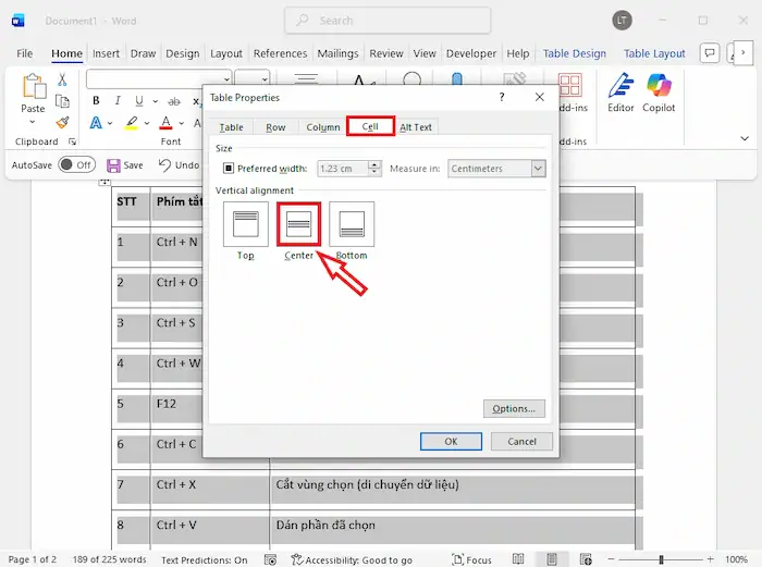 Cách căn giữa ô trong Word với Table Properties