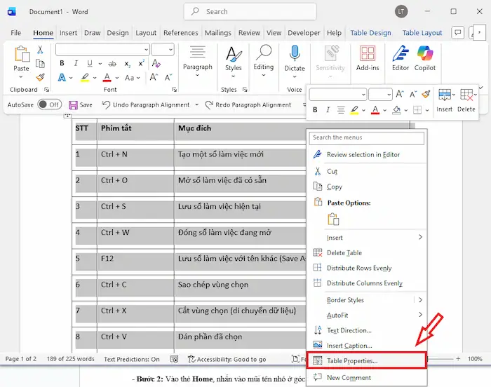 – Bước 2: Click chuột phải >> nhấn chọn Table Properties (Thuộc tính bảng).