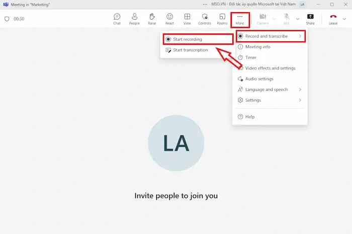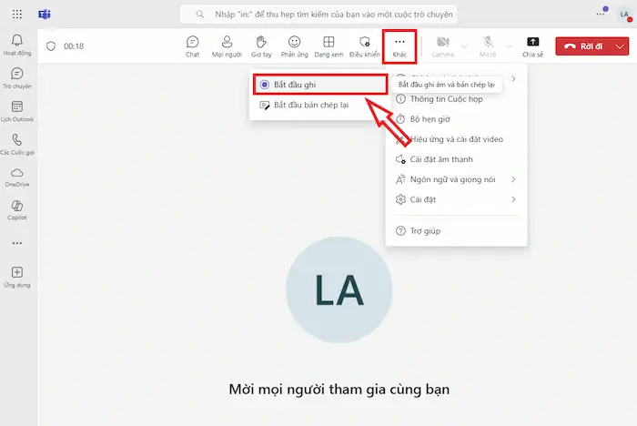 – Bước 2: Nhấp vào biểu tượng ba chấm (…) trên thanh điều khiển >> chọn Record and Transcribe >> chọn Start recording (Bắt đầu ghi).