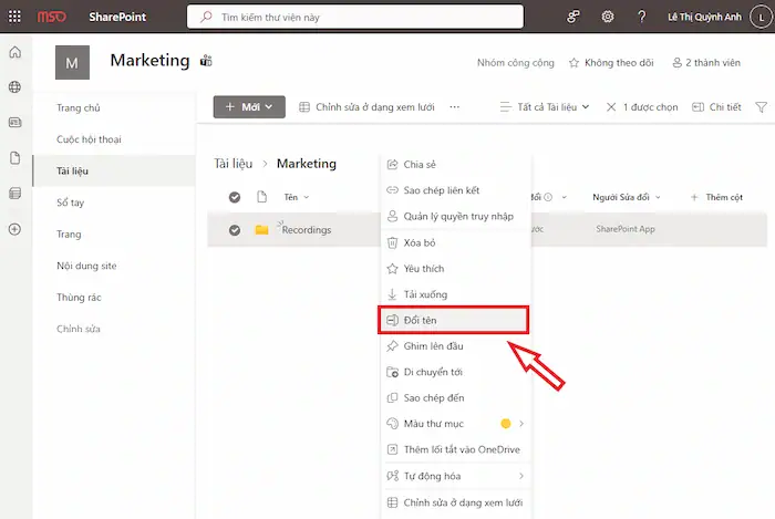- Đổi tên bản ghi: Truy cập OneDrive hoặc SharePoint >> click chuột phải vào tệp ghi và nhấn chọn Đổi tên.