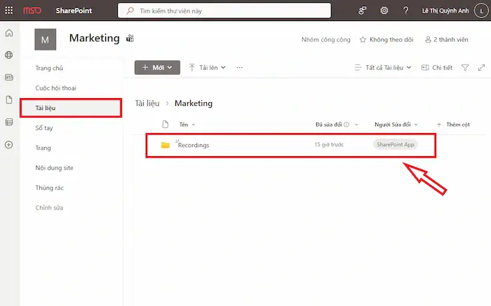 - Cuộc họp trong kênh nhóm: Bản ghi được lưu trong thư mục SharePoint của nhóm, tại đường dẫn: Teams >> Tên nhóm >> Tên kênh >> Tệp >> Bản ghi.