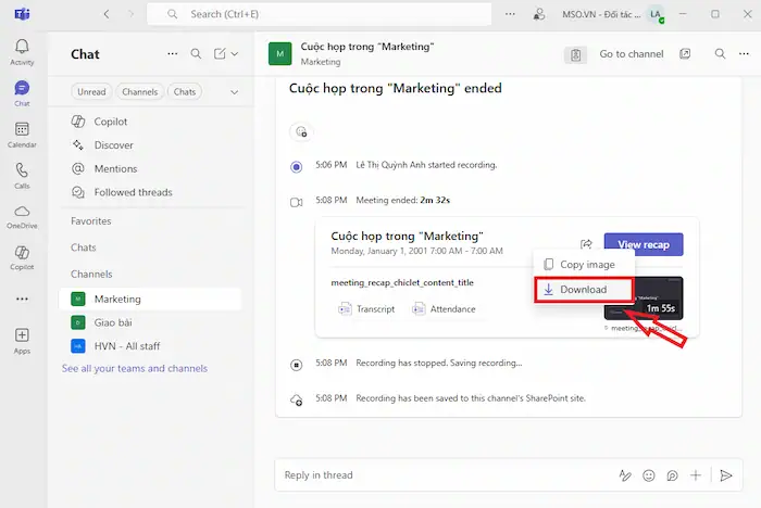 - Tải xuống bản ghi: Mở bản ghi từ Chat hoặc Tệp >> click chuột phải vào bản ghi và chọn Tải xuống (Download).