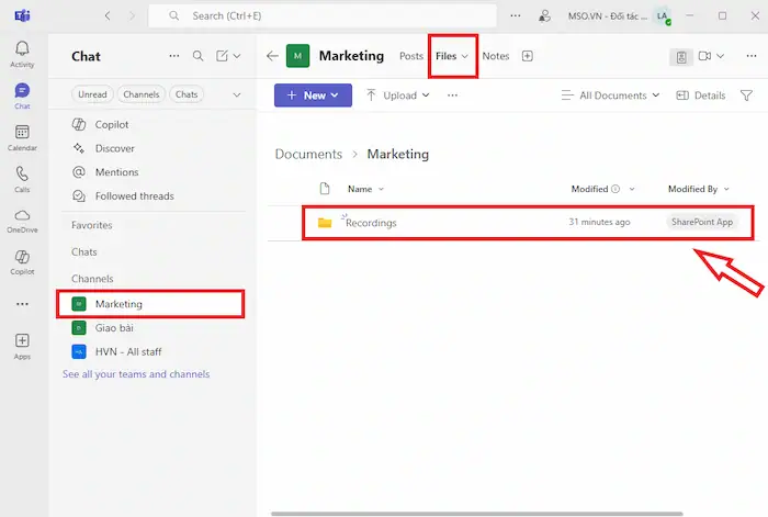 - Đối với cuộc họp kênh (Channel Meeting): Bản ghi sẽ được lưu trữ trong thư mục Files của kênh trên SharePoint.