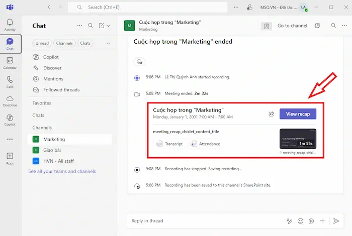 – Bước 3: Sau khi kết thúc, bản ghi sẽ được lưu vào OneDrive (đối với cuộc họp riêng tư) hoặc SharePoint (đối với cuộc họp trong kênh nhóm).