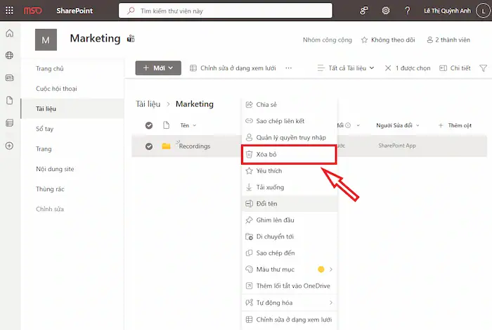 - Xóa bản ghi: Tương tự, truy cập OneDrive hoặc SharePoint >> click chuột phải vào tệp ghi và chọn Xóa.