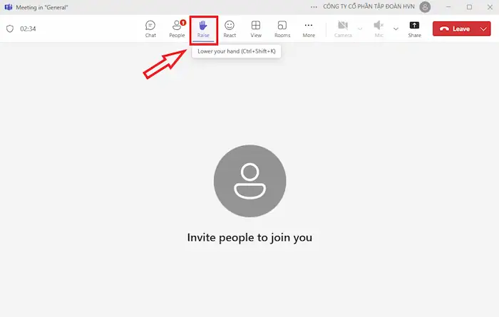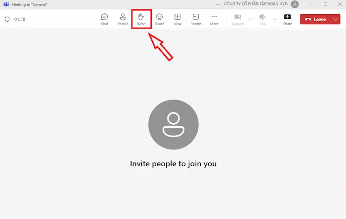 – Bước 3: Trên thanh công cụ, bạn sẽ thấy một loạt các biểu tượng điều khiển (như micro, camera, chia sẻ màn hình). Tìm biểu tượng ứng với tùy chọn Giơ tay (Raise hand).