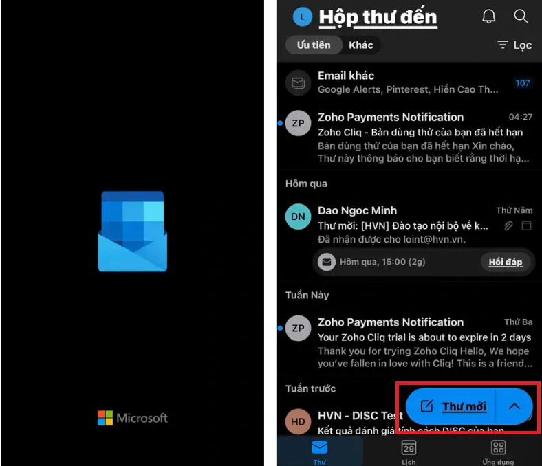 - Bước 1: Mở ứng dụng Outlook đã được cài đặt trên thiết bị di động của bạn. Nhấn vào biểu tượng Thư mới, thường là một cây bút chì hoặc dấu cộng ở góc dưới cùng bên phải màn hình.