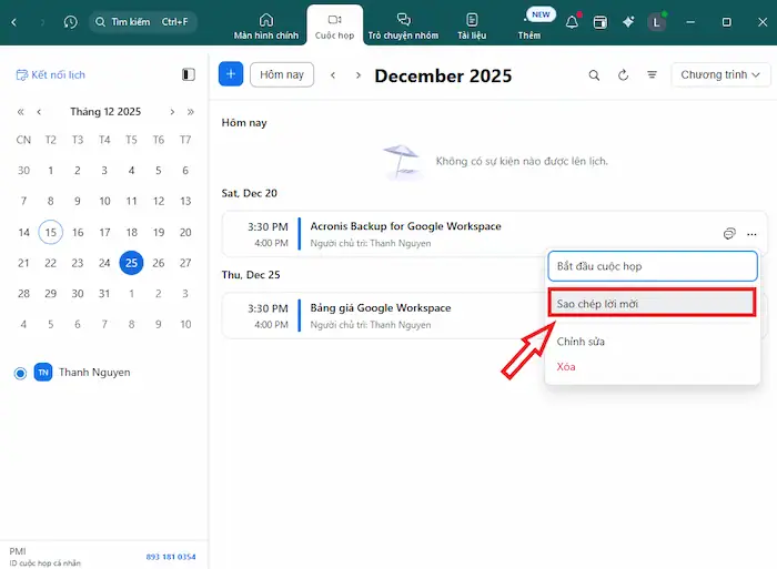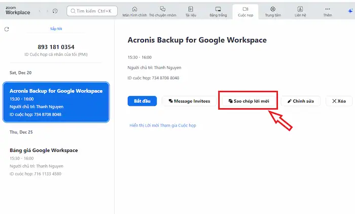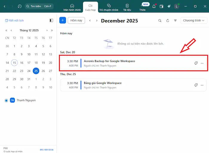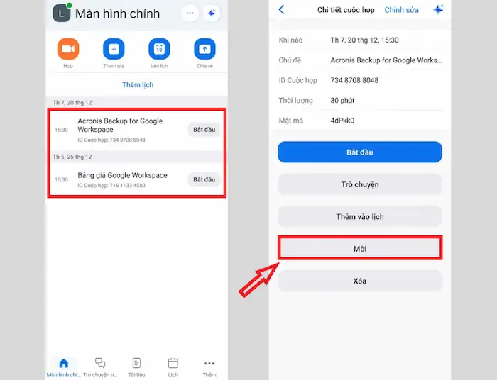 Bước 2: Chọn cuộc họp trong danh sách đã lên lịch