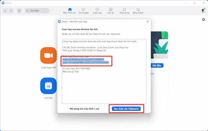 *Mẹo hay: Khi bạn nhấp vào Copy Invitation, Zoom sẽ sao chép toàn bộ thông tin lời mời (bao gồm Link, Meeting ID, Passcode, và các số điện thoại gọi vào) vào bộ nhớ tạm.