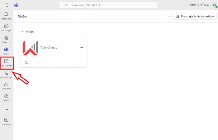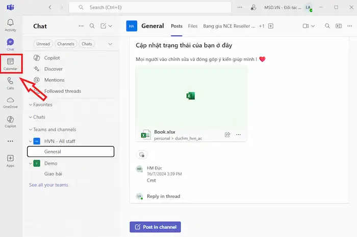 – Bước 2: Ở thanh bên trái của cửa sổ Microsoft Teams, bạn sẽ thấy biểu tượng Lịch (Calendar), nhấn vào đó để truy cập vào lịch công việc của bạn.