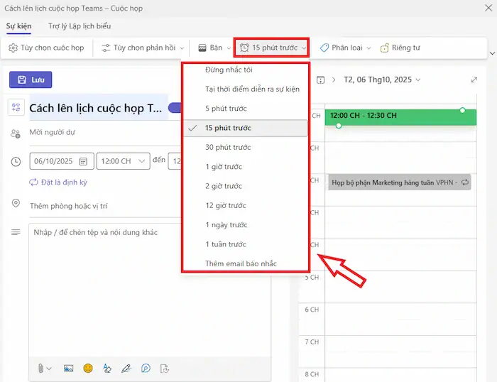 - Thời gian nhắc nhở: Bạn có thể cài đặt nhắc nhở trước cuộc họp ở các khoảng thời gian khác nhau (ví dụ: 10 phút, 15 phút trước cuộc họp).