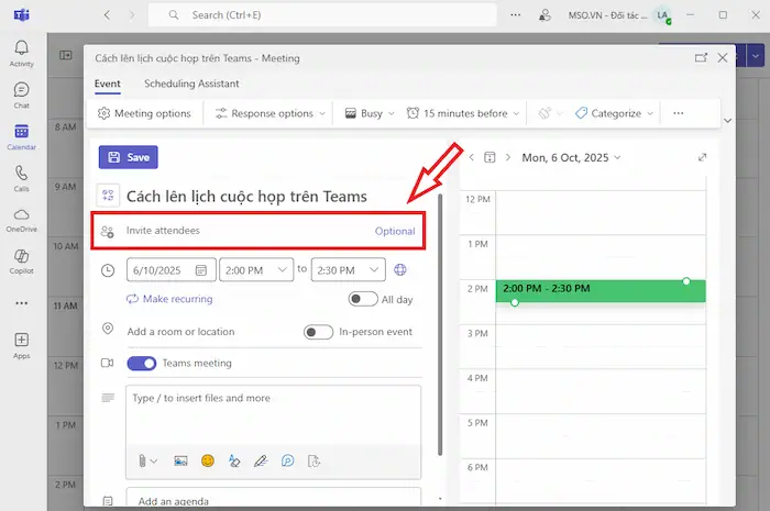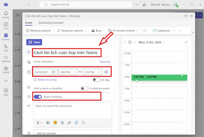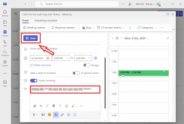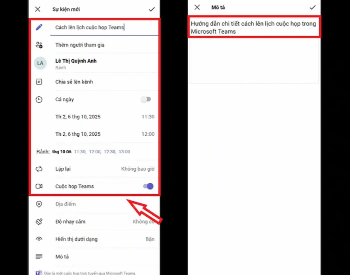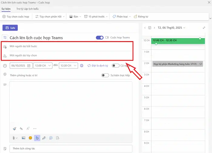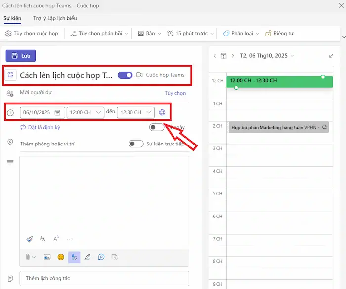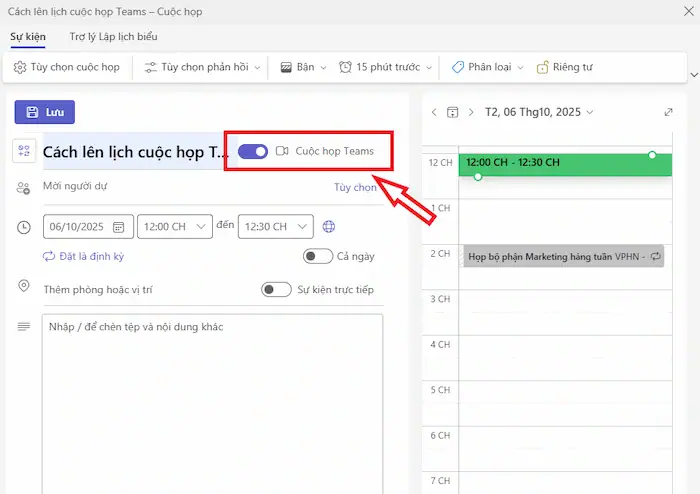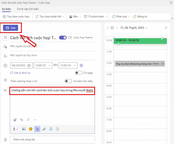 - Thêm chi tiết vào cuộc họp: Cuộc họp sẽ chứa thông tin chi tiết như liên kết Teams, thời gian, và người tham gia, giúp việc tham gia cuộc họp trở nên dễ dàng.