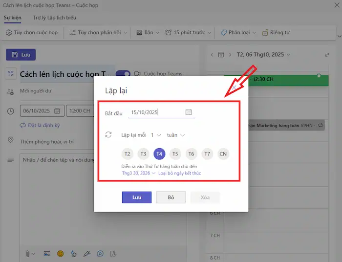 - Lặp lại theo các ngày trong tuần: Tùy chọn cuộc họp chỉ diễn ra vào các ngày thứ Hai hoặc Thứ Tư trong tuần.