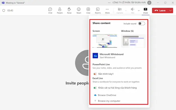 Khi chia sẻ màn hình hoặc cửa sổ, bạn có thể chọn bật tùy chọn Include computer sound (Bao gồm âm thanh máy tính). Điều này cực kỳ quan trọng nếu bạn muốn phát một đoạn video, nhạc, hoặc bất kỳ âm thanh nào khác từ máy tính của mình cho những người tham gia cuộc họp.