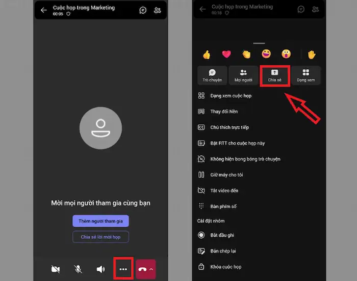 – Bước 3: Tương tự như ứng dụng trên máy tính, bạn sẽ tìm thấy biểu tượng Chia sẻ (Share) – hình chữ nhật có mũi tên đi lên – trong thanh công cụ điều khiển cuộc họp. Hãy nhấp vào biểu tượng này.