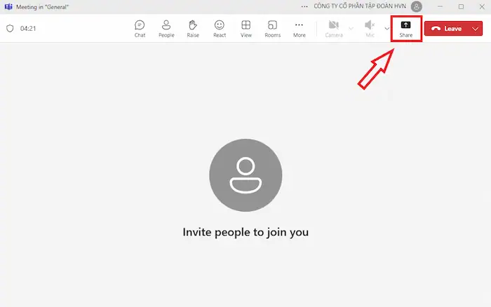 – Bước 2: Trong thanh công cụ điều khiển cuộc họp (thường nằm ở phía dưới màn hình), bạn sẽ thấy một biểu tượng hình chữ nhật có mũi tên đi lên. Đây chính là biểu tượng Chia sẻ (Share). Nhấp chọn biểu tượng này.