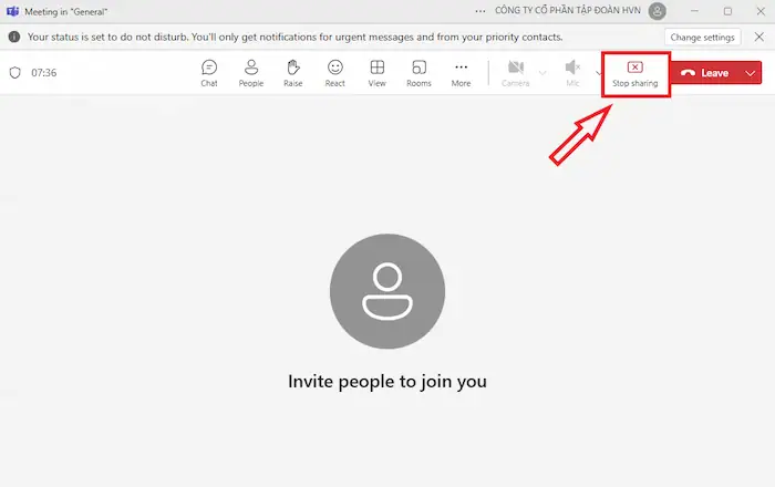 – Bước 7: Nhấp vào nút Dừng chia sẻ (Stop sharing) hoặc biểu tượng chia sẻ đang hoạt động trên thanh công cụ Teams.