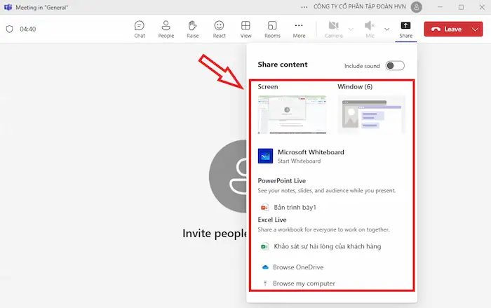 - Bao gồm âm thanh hệ thống (Include system audio): Nếu bạn đang chia sẻ một video, nhạc hoặc bất kỳ nội dung nào có âm thanh, hãy đảm bảo chọn tùy chọn này (bằng cách bật công tắc hoặc đánh dấu vào ô vuông) để người tham gia cuộc họp có thể nghe được âm thanh đó.