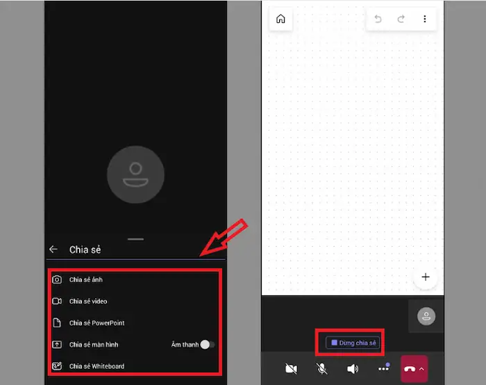 - Chia sẻ bảng trắng (Share whiteboard): Mở một bảng trắng ảo để cộng tác.