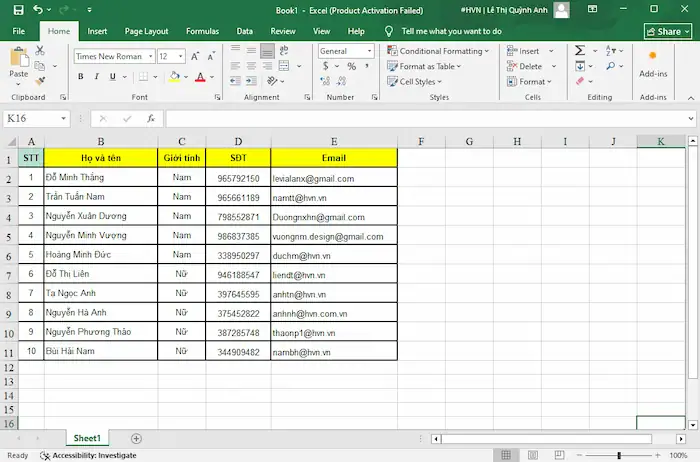 - Tạo một bảng tính Excel với các tiêu đề cột rõ ràng (ví dụ: Họ tên, Địa chỉ, Email, SĐT, Sự kiện, Ngày,…).