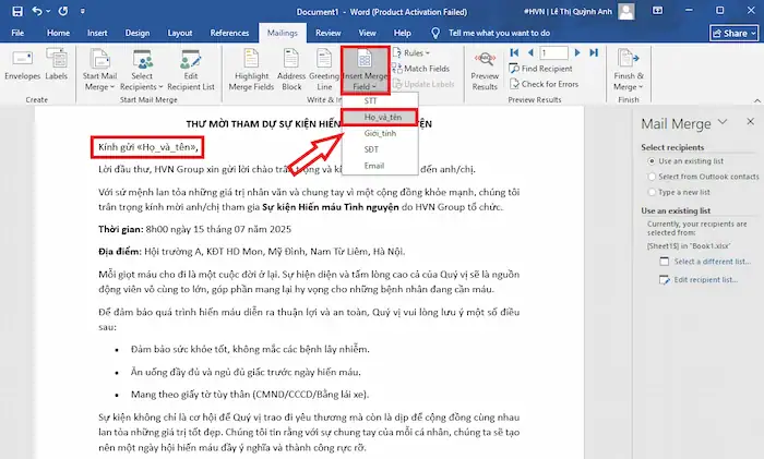 - Đừng gõ lại: Tuyệt đối không gõ thủ công thông tin cá nhân hóa vào tài liệu chính. Thay vào đó, hãy sử dụng tính năng Insert Merge Field để chèn các trường trộn.