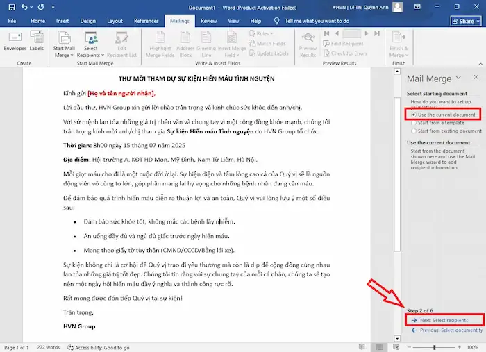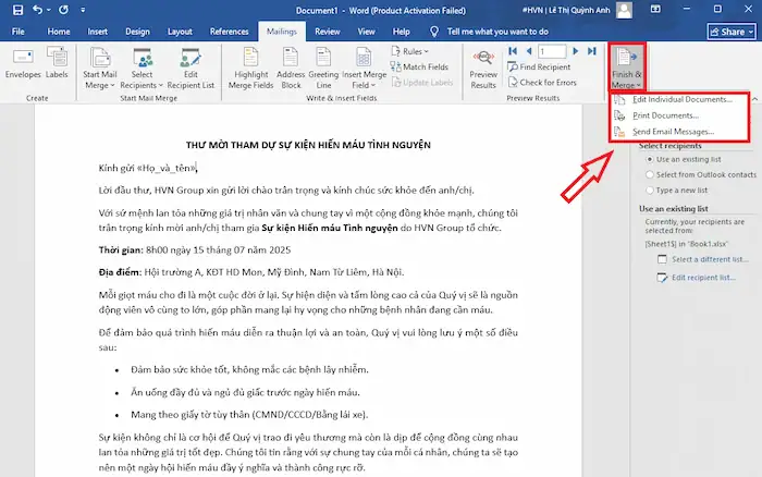Khi đã hoàn tất việc tạo danh sách và tài liệu chính cho cách sử dụng Mail Merge trong Word, bạn sẽ tiếp tục tiến hành với việc trộn thư: