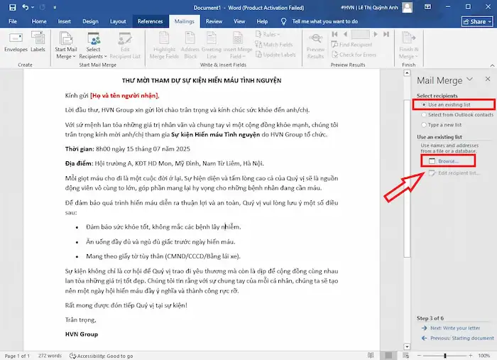 – Bước 5: Tiếp tục nhấn chọn Next: Select recipients >> chọn Use an existing list >> nhấp Browse… để tìm và chọn tệp Excel (hoặc nguồn dữ liệu khác) mà bạn đã chuẩn bị.