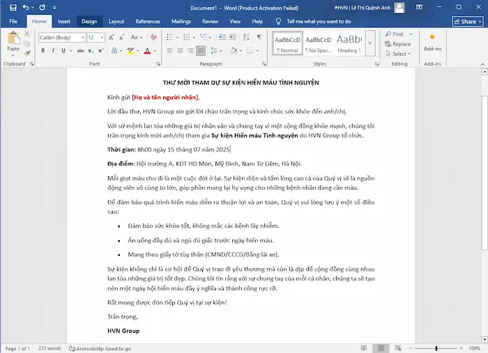 - Nhập nội dung chung của tài liệu và để trống những vị trí cần chèn thông tin cá nhân hóa.