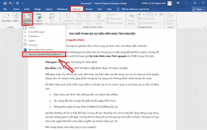 – Bước 2: Chọn Start Mail Merge >> chọn Step-by-Step Mail Merge Wizard… để bắt đầu từng bước với việc trộn thư.