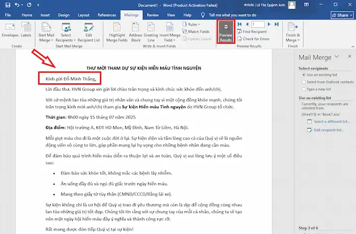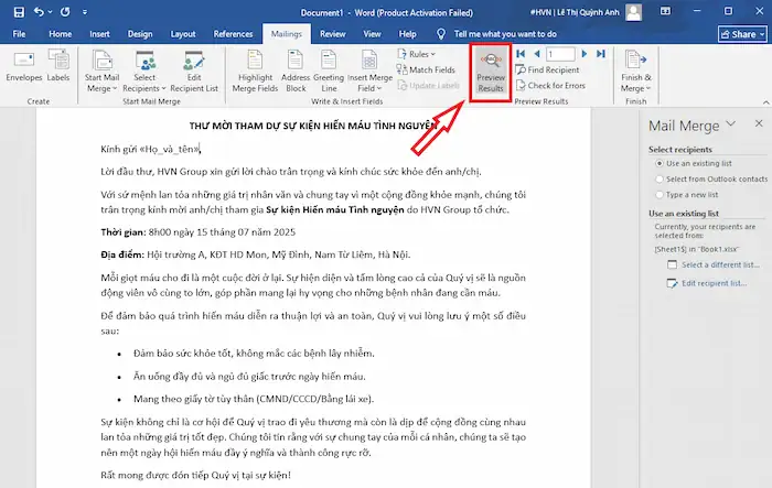 - Sử dụng tính năng Preview Results: Hãy nhấp vào Preview Results trên tab Mailings để xem tài liệu của bạn trông như thế nào với dữ liệu thực tế.