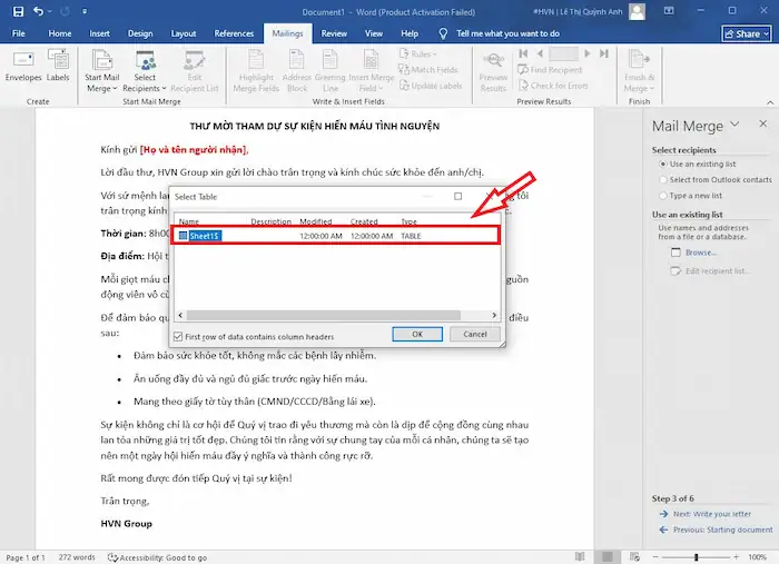 *Lưu ý: Nếu tệp Excel có nhiều bảng tính, hãy chọn bảng tính chứa dữ liệu của bạn. Hộp thoại Mail Merge Recipients sẽ hiển thị danh sách để bạn kiểm tra, lọc hoặc sắp xếp (nếu cần) >> nhấn OK để hoàn tất thiết lập.