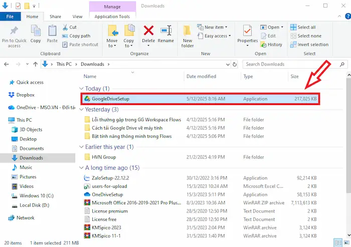 – Bước 1: Mở tệp cài đặt: Điều hướng đến thư mục Tải xuống (Download) và nhấn đúp vào tệp GoogleDriveSetup.exe (hoặc tên tương tự).