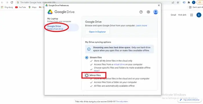 - Mirror files (Phản chiếu tệp): Tất cả tệp từ Drive sẽ được tải xuống máy tính và chiếm dụng dung lượng ổ cứng của bạn. Tuy nhiên, bạn có thể truy cập chúng ngay cả khi không có kết nối Internet.