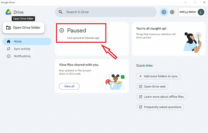 Sau khi cài đặt, nếu các tệp trên máy tính và trên Drive không cập nhật cho nhau, hãy làm theo các bước sau: